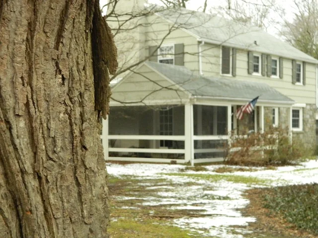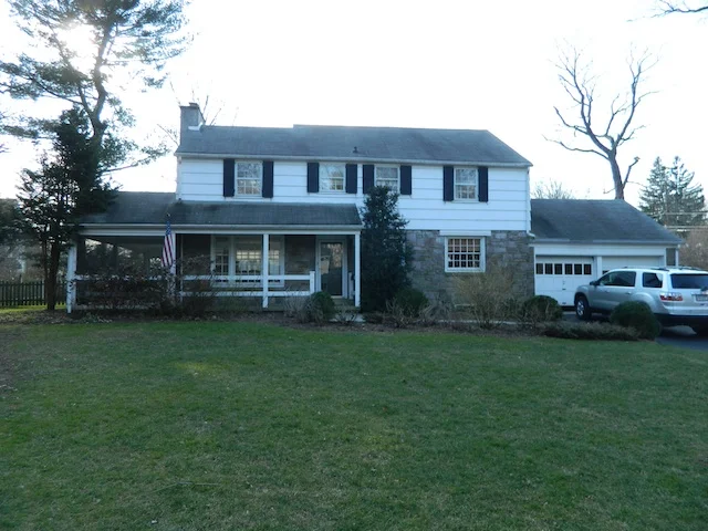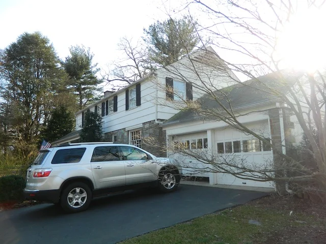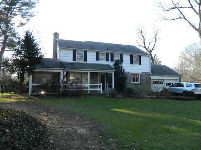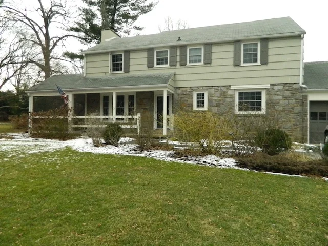 As you can see, the house's facade had stone detail with BRIGHT white siding and black trim, which was stark and cold next to the earth tones of the stone. I was excited that my clients were game to change their color palette, and knew that we could achieve a much more cohesive and inviting look...