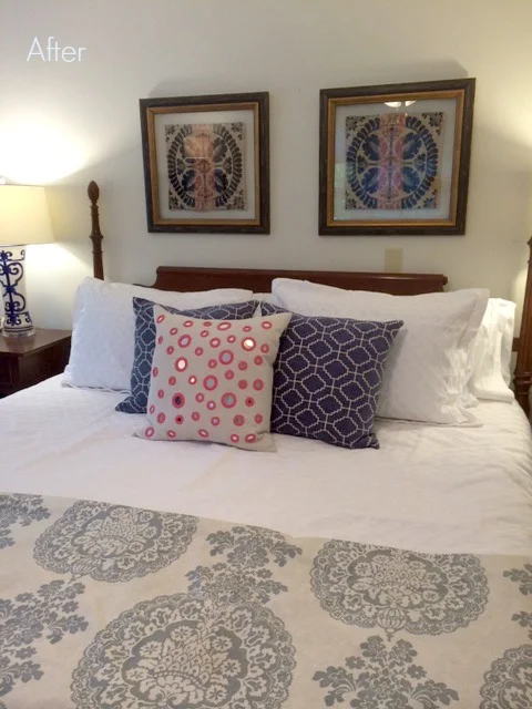 Also, to give the eye a bit of a break from the many patterns in the room, we incorporated a new white coverlet and pillow cases. The additional throw pillows resonate with the colors from the wall hangings. The center pillow is so different with its terra cotta stitching and mirrored details--also from India, I practically jumped up and down when I found it!! :)