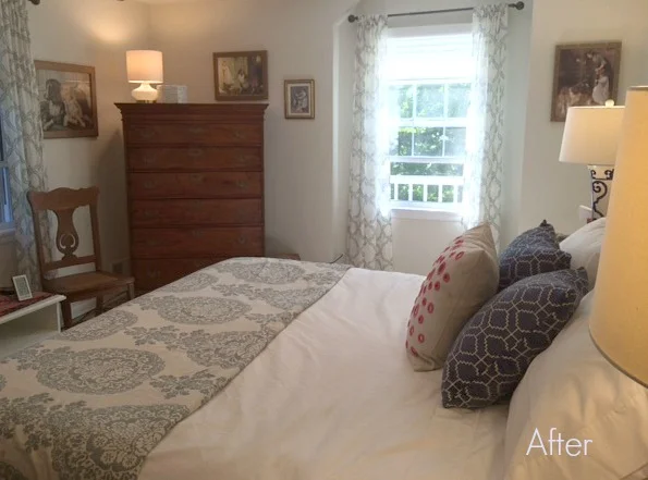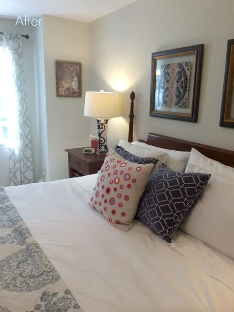 My clients called me to help them pull the room together. A lot was already in place: a bed and duvet they liked, walls freshly painted in off-white, curtains they had just purchased, family heirloom tapestries brought back from India a couple of generations ago...