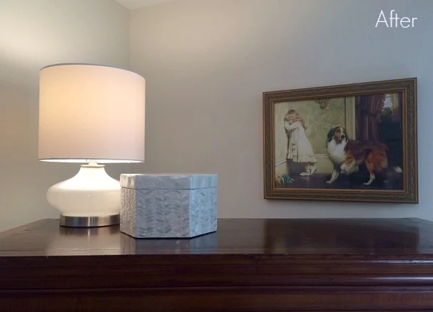 New lighting throughout the room was needed, and after I gave them my input for what they should look for, my clients found lamps while on vacation--blue and white to fit with the color scheme.