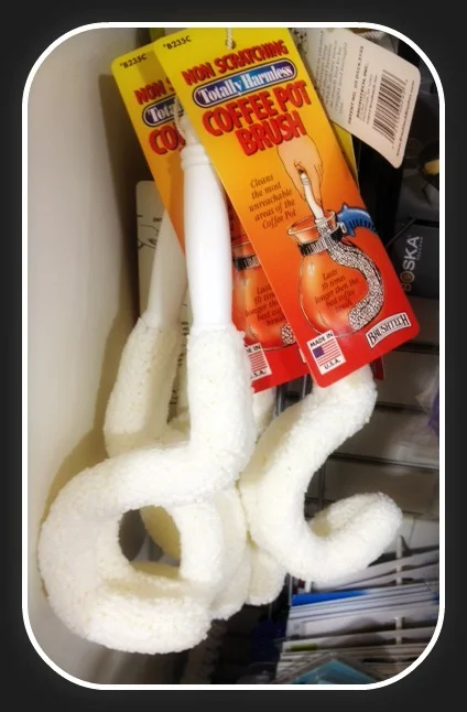 "OOH!" I thought, "A coffee pot brush! It is squishy, and... so SQUISHY! and....there is a handle! And it says it is 'totally harmless'...FASCINATING. Oh, I WANT that! How squishy!"