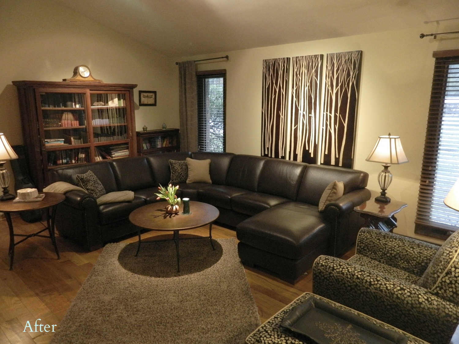 My clients found the beautiful artwork now hanging behind the sectional on their vacation to North Carolina. I love what it adds to the room, and we added further texture and interest with the fabrics for the chair, pillows and new window treatments that soften the space.